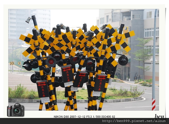 台鐵大門口忙旁豎著一大堆平交道警示燈